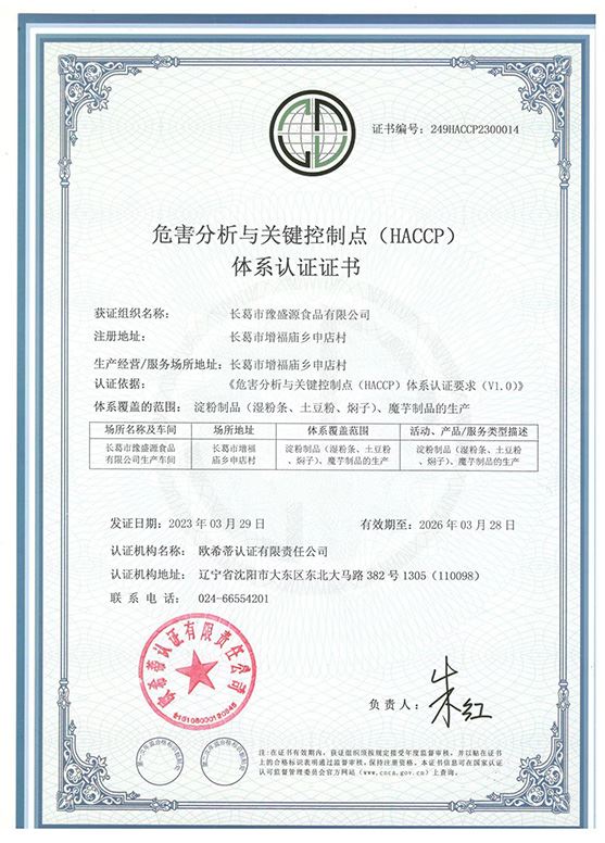 危害分析與關(guān)鍵控制點(diǎn)體系認(rèn)證證書(shū)