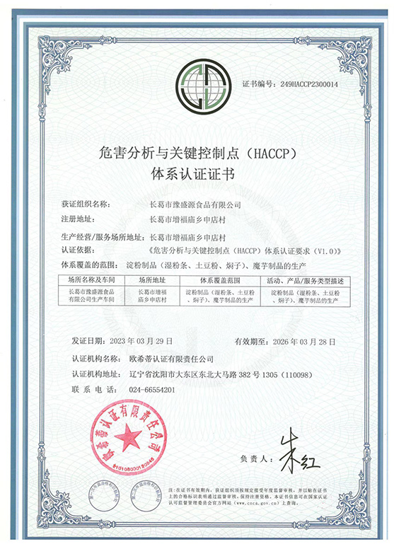 危害分析與關(guān)鍵控制點(diǎn)體系認(rèn)證證書